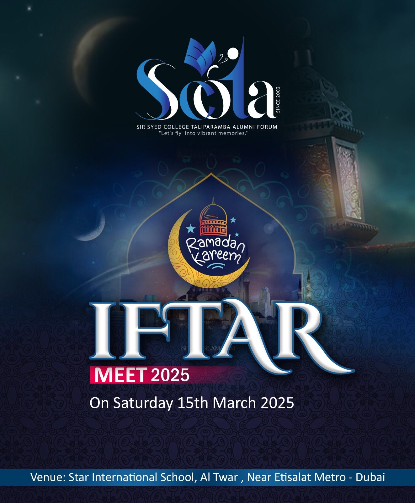 ദുബൈl സർ സയ്യദ് കോളേജ് അലൂമിനി ഫോറം യുഎഇ ചാപ്റ്റർ(സ്കോട്ട ), അതിന്റെ അംഗങ്ങൾക്കും കുടുംബാംഗങ്ങൾക്കുമായി ഇഫ്താർ സംഘടിപ്പിക്കും. മാർച്ച് 15 ന് ശനിയാഴ്ച ഇത്തിസലാത്ത് മെട്രോ സ്റ്റേഷനടുത്തുള്ള സ്റ്റാർ ഇന്റർനാഷണൽ സ്കൂളിലാണ് ഇഫ്താർ സംഗമം . മീറ്റിൽ പങ്കെടുക്കാനാഗ്രഹിക്കുന്നവർ ഓൺലൈൻ വഴി രെജിസ്ട്രേഷൻ പൂർത്തിയാക്കണമെന്ന് ഭാരവാഹികൾ അറിയിച്ചു. കൂടുതൽ വിവരങ്ങൾക്ക് താഴെ പറയുന്നവരുമായി ബന്ധപ്പെടുക ഹാഷിം – 050 746 9723 ഷംഷീർ – 050 2094427 ജുനൈദ് – 052 168 2440